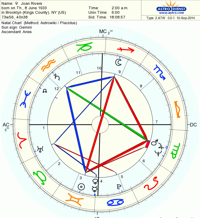 Joan has the Sun, Mercury and Venus placed in Gemini in the 3rd house. Her catchphrase was ” Can we talk? ” Priceless! She was a skilled communicator who exhibited a mulit-faceted personality. Her moon in Sag in the 9th propelled her to speak the truth and do it with fierceness, vulgarity, and brutal honesty. She made us laugh and she made us think. Aries rising was quite prominent in her chart. The chart ruler Mars was part of a Mars Jupiter Neptune stellium in the 6th house of work. health, service. She was devoted to her charity work in addition to maintaining her non-stop career. This stellium opposed Saturn in Aquarius in the 11th and squared her Sun in the 3rd. Fear of losing the crowd was a constant threat as was her fear of being different. With Uranus in the first, I think she just wanted to fit in and kept augmenting her physical appearance to be accepted by the masses. Pluto squared Uranus and it is interesting that she passes during the current Pluto square Uranus cycle. While she lacks Scorpio planets, Mars is the traditional ruler of Scorpio and it dominates her chart. Her chart Mars rules her 8th house and 8th house matters seemed to predominate her life. Death and sex and shared assets seemed to be areas of initial vulnerability and eventual mastery over the course of her 81 years.